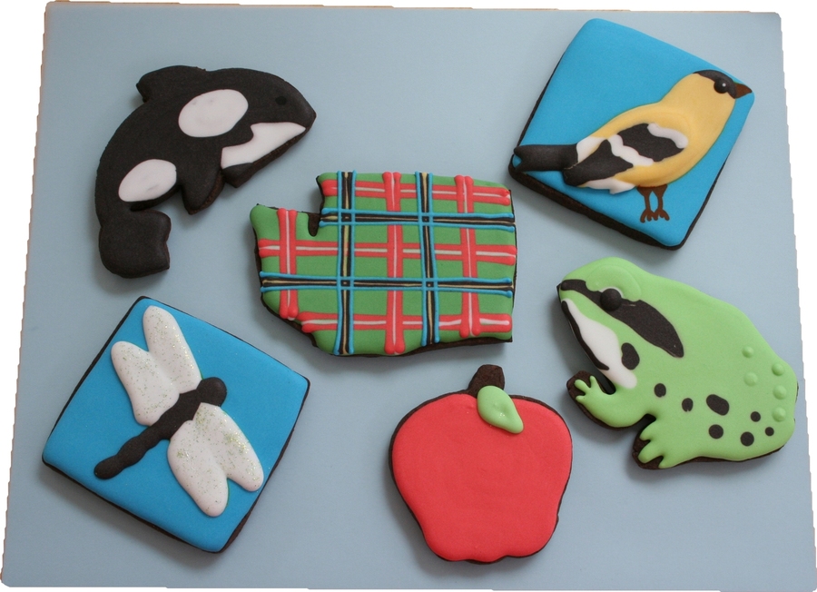 This group of cookies was made as a present for someone I know that is in the midst of a move to Washington State. I wanted to be creative, because she is a cookie decorator, too, so decided to make the state "symbols"... the an orca (state mammal), an apple (state fruit), pacific chorus frog (state amphibian), green darner dragonfly (state insect), and the yellow goldfinch (state bird). And the Washington state shape is covered in the state Tartan.