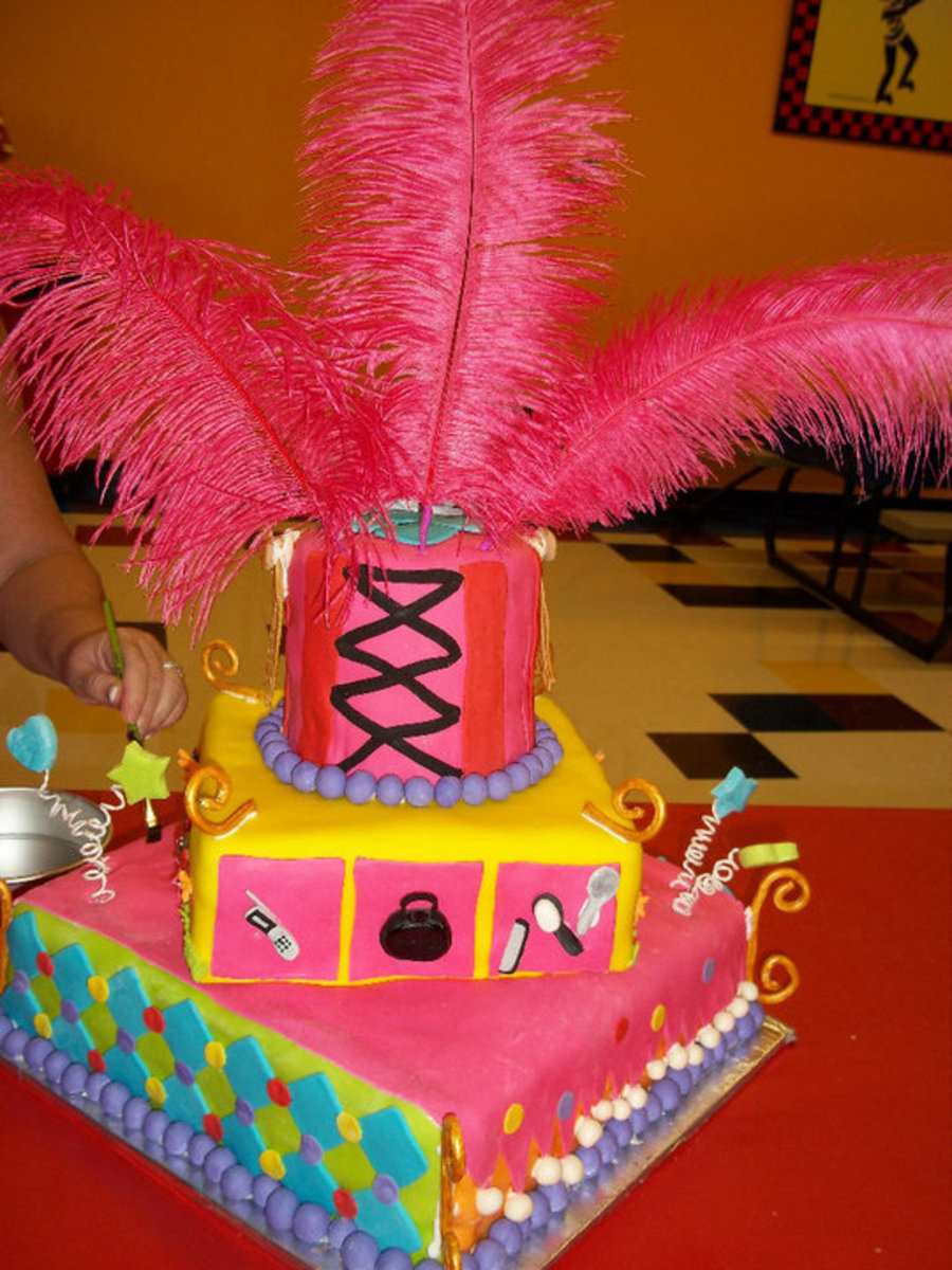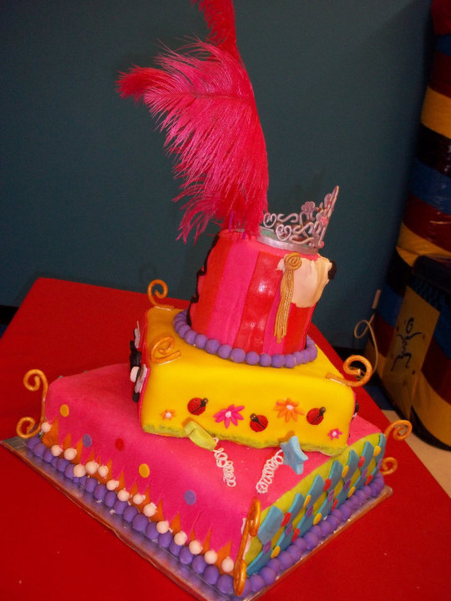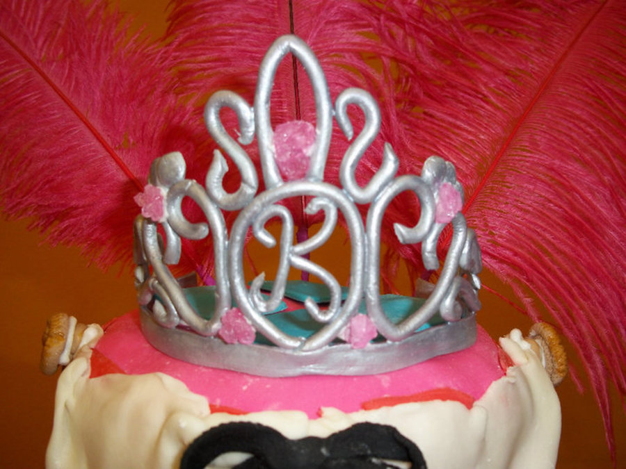 Cake # 4. The young lady wanted a crazy, colorful cake with feathers and a crown. It was a fun cake to do, but I am still learning. Each layer was a different flavor cake. It is fondant covered and decorated with fondant and gum paste. The tiara is gum paste with rock candy jewels. Thanks to all of the beautiful cakes on here for helping with my inspiration.