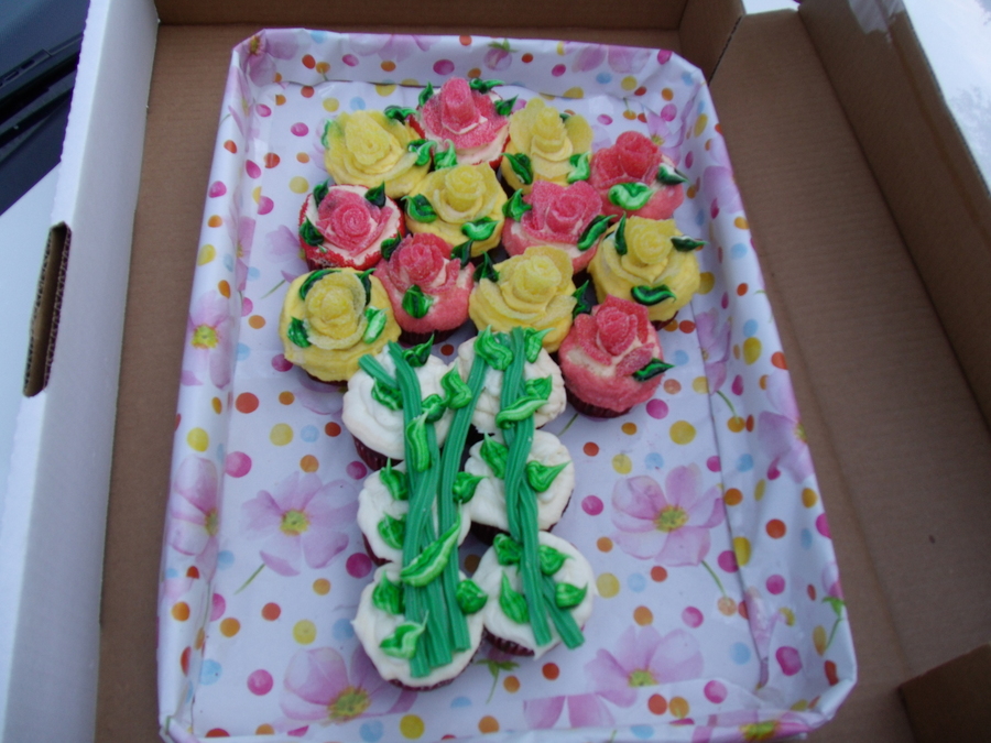made with fruit slices & twistlers. red velvet cupcakes with cream cheese icing