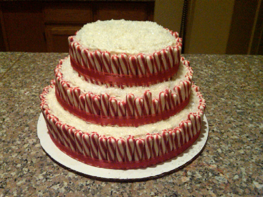 Saw something like this in a magazine and tried to replicate it in my own way. REd Velvet cake with cream cheese icing, surrounded by soft peppermint sticks and sprinkled with large granules of sugar for "sparkle". Ribbon is non-edible - decoration only.