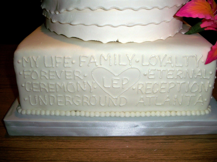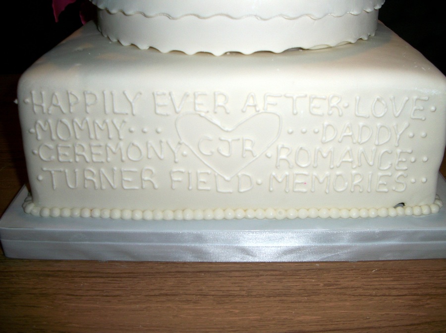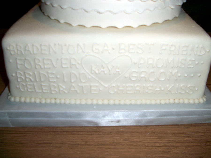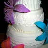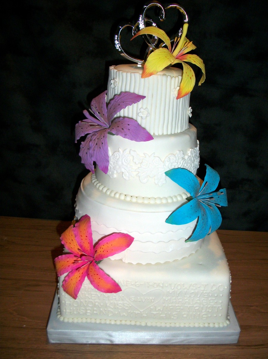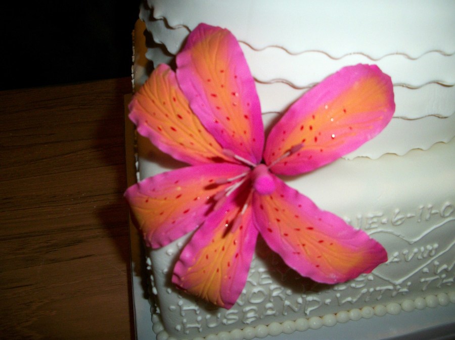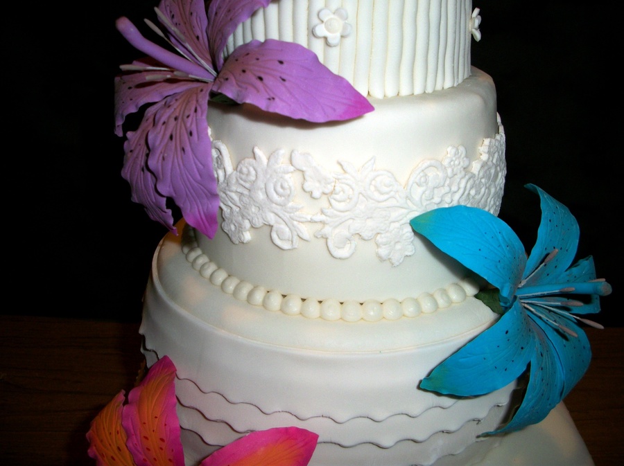 This cake was inspired by the bride's dress. It was a tropical wedding, with different colored lilies. It was also the first time I got to use one of the new lace molds....I AM IN LOVE WITH THEM!! TFL!