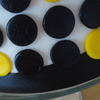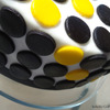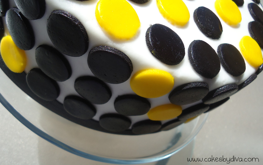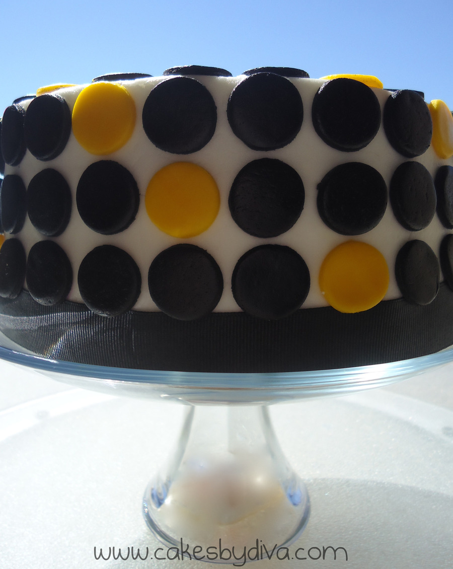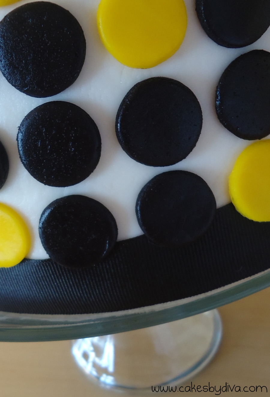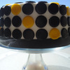 This cake was a last minute order. Made for a few of the corrections officers at the local prison. Chocolate cake covered and filled with buttercream. Dots are marshmallow fondant. Retro/modern design.