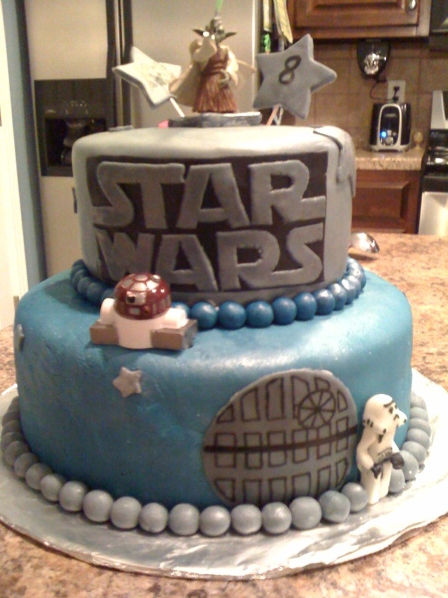 This cake was made for my son. He had a last minute birthday party, he saw the picture online of a similar cake and this is how it turned out. It is fondant covered and has fondant decorations. Yoda is a toy firgure. Storm Trooper was fondant.