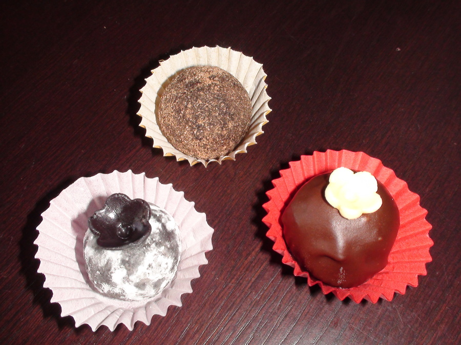 first time chocolate & baileys cake ball one with sugar & fondant flower, one with cacao powder with vanilla sugar and the other one is dark chocolate. Yummy!!!