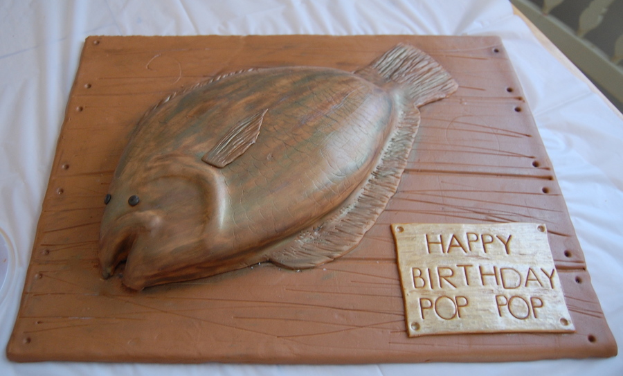 My dad loves to fish so this was his birthday cake. Board covered in MMF. Fish is a chocolate cake with vanilla buttercream (his fav) covered in MMF. Used luster dust to get the coloring on the fish and edible gold paint on the "plaque"
