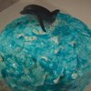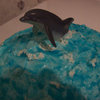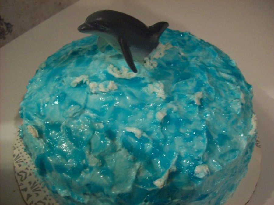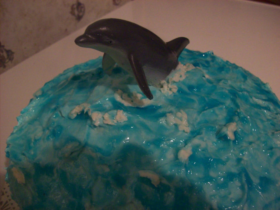 Confetti cake with homemade butter cream icing, I dirty iced the cake in white butter cream, froze it, then iced it in blue butter cream using the back of a spoon to make waves, I placed a plastic dolphin toy from the aquarium, and froze the cake again, so the butter cream was stiff. Then I painted/dabbed dyed piping gel onto the stiff butter cream using a basting brush, and piped white icing on as whitecaps for the waves. This was a huge hit at my twins' 6th birthday party which was a dolphin themed pool party.