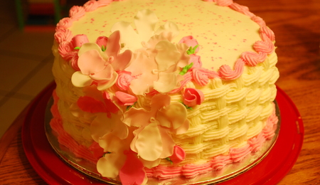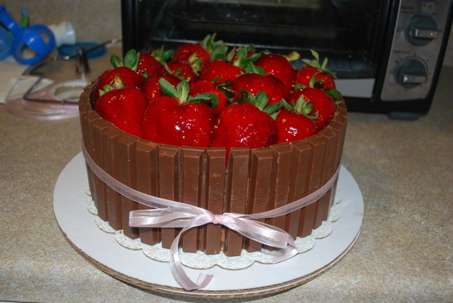 This cake is french vanilla with chocolate buttercream and topped with glazed strawberries.