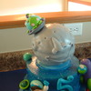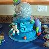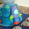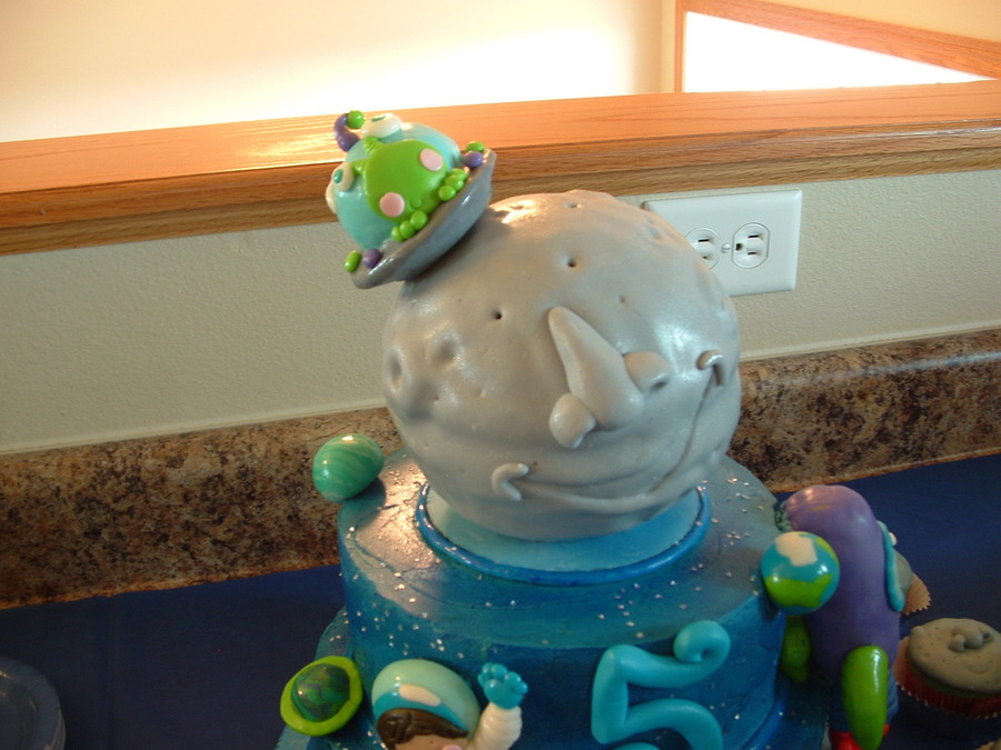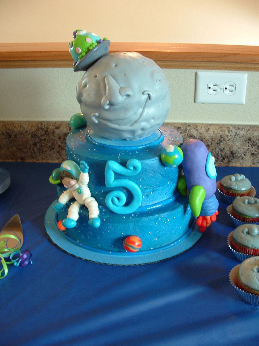 Three tiered Outerspace themed birthday cake. The moon was made using the Wilton ball pan and covered in gray marshmallow fondant. 8 inch and 10 inch two layer cakes, frosted in blue tinted butter cream, than sprayed with wilton's blue color mist. Silver edible stars were sprinkled onto the surface of the cake. The rocket and the UFO were made of RKT covered in fondant. The planets, astronaut and the number 5 were all made out of marshmallow fondant. Thank's for looking!