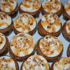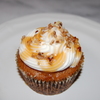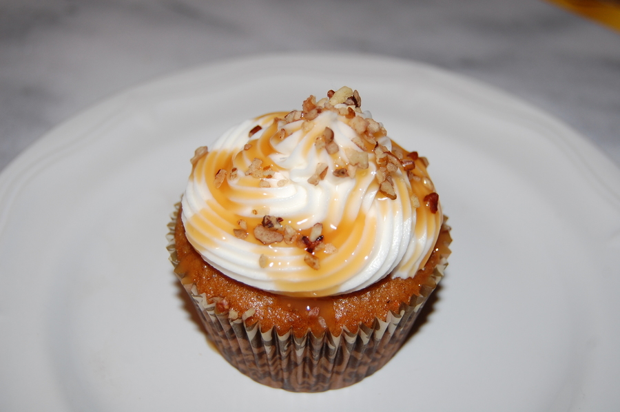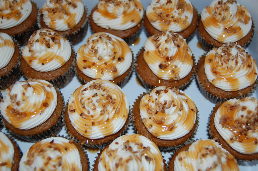 Carrot Cupcakes with cream cheese icing drizzled with caramel and pecans.