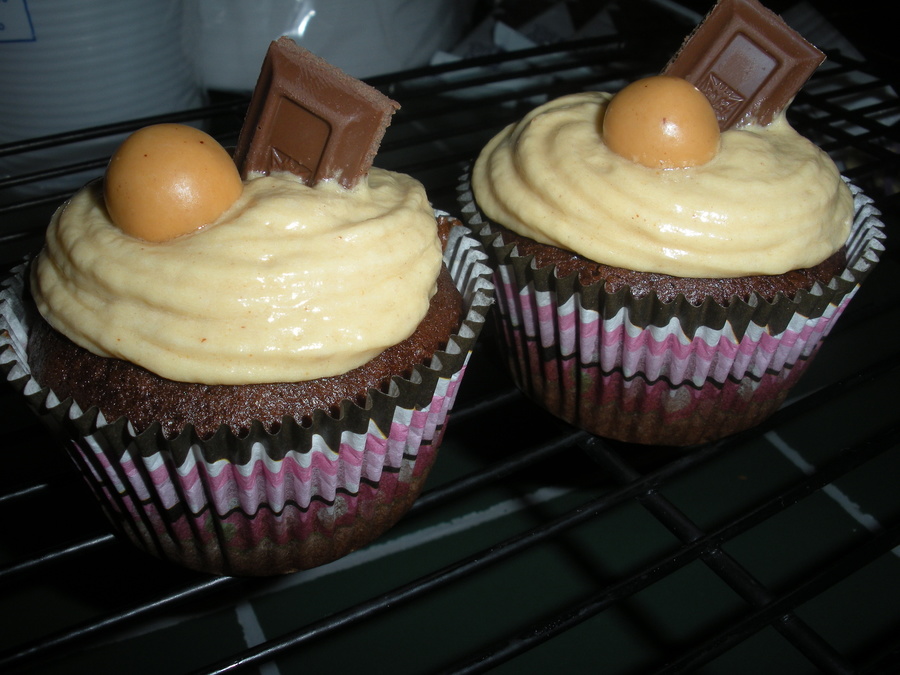 Chocolate banana cupcakes with peanutbutter frostin topped witha hershy bar and a reeses candy