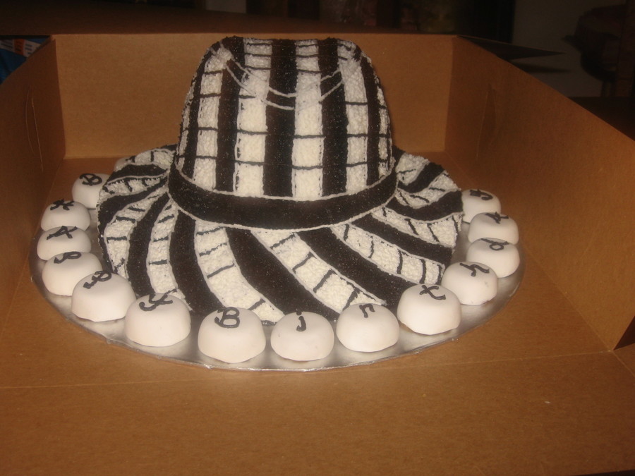 I made this for my cousin's birthday. She wanted me to duplicate her hat .This was one 12"and two 9" round yellow cakes that I carved to make the shape of the hat. I decorated this cake with buttercream icing. I also made little round cakes and covered them with white fondant .