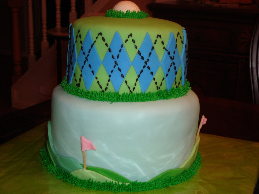 Simple golf cake I got from great designs here at CC. Lemon pound cake and Butter Cake with BC filling- Fondant covering and accents. Candyt melts Golf ball--TFL!