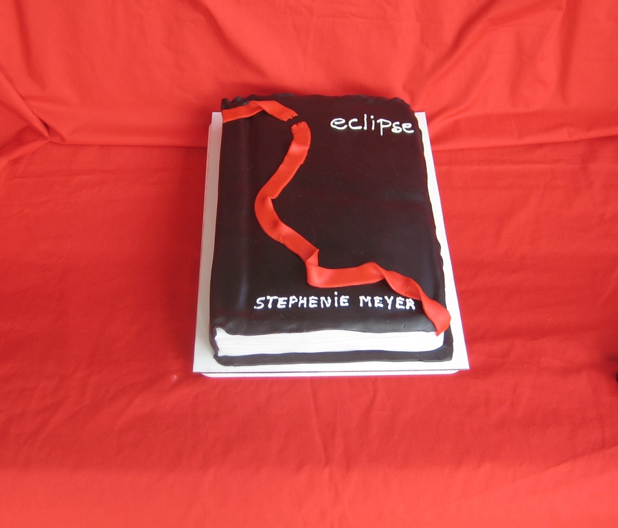 Triple chocolate cake, ganache undercoat with Duff's black fondant. Ribbon is red mmf, and writing is piped in buttercream. A birthday cake for one of my girlfriends, she loves the Twilight Saga. My first book cake.