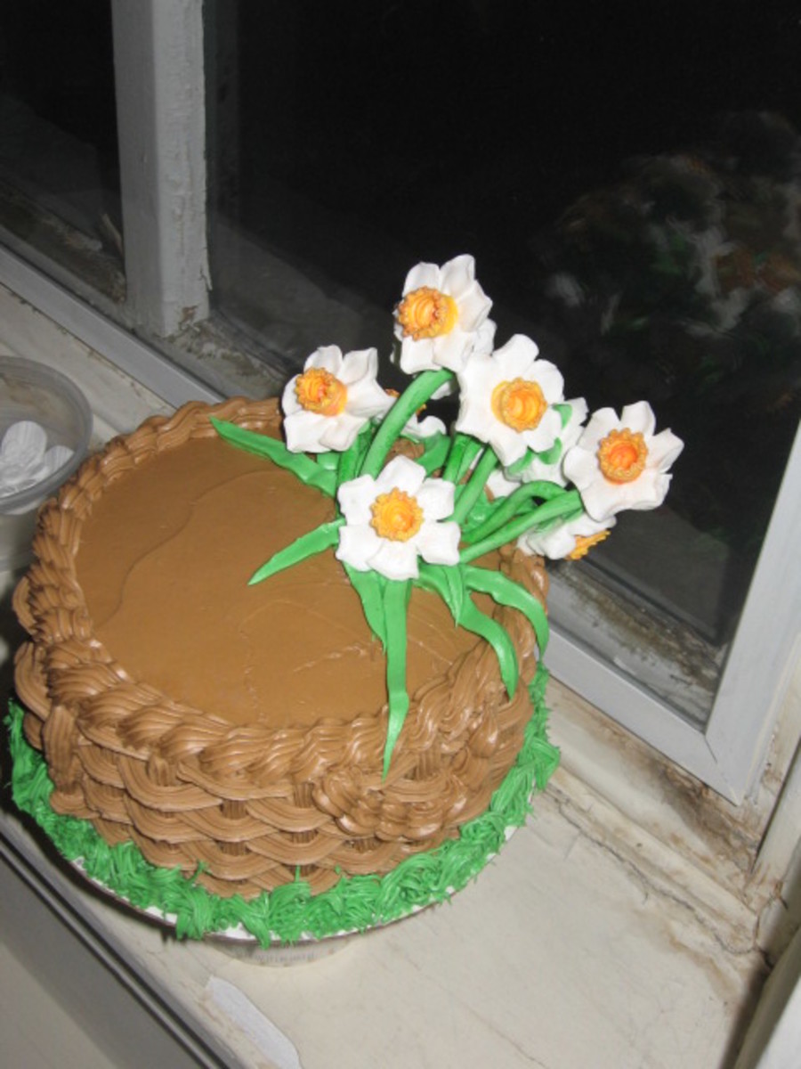 Okay so I was taking wilton classes one and two and the same time and just finished lesson two tonight. I made royal icing daffodils which I attached a gum paste stem. The freshly "pick " daffodils are resting in a basket weave 6 in round cake. I would love to hear what you think of the work I did.? I love feed back and comments Thank you