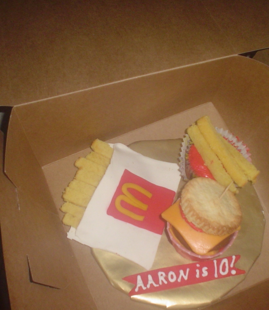 I made one of these "meals" last week as a treat for a niece who recently had a bithday. My nephew (her cousin) asked me to make him the same exact thing for his birthday, which is tomorrow. Fries and burger bun are cake, everything else is gumpaste or fondant. TFL