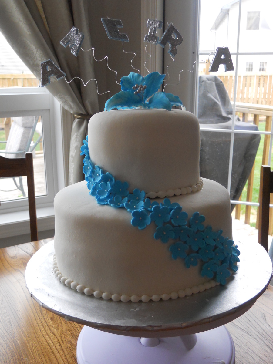 This cake was for a little girls first birthday.It's a two tier vanilla cake covered with MMF. Blue gumpaste flowers.