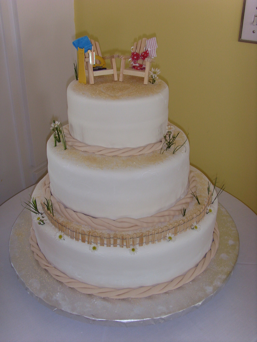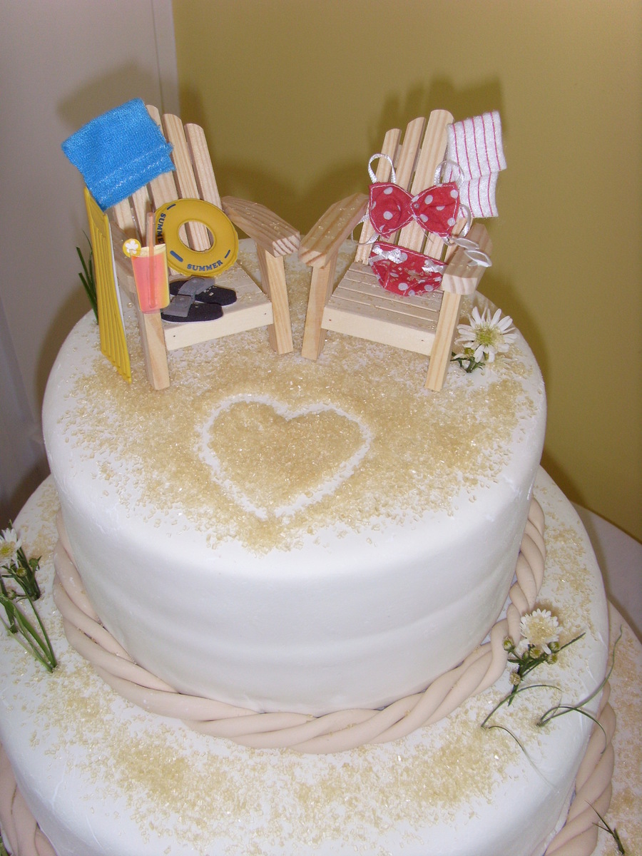 Fondant covered 3 tier wedding cake. We used cinnamon and sugar for the "sand", colored fondant for the rope and got the beach chairs and swim wear at Michael's craft store.