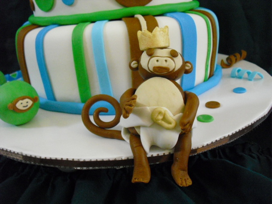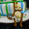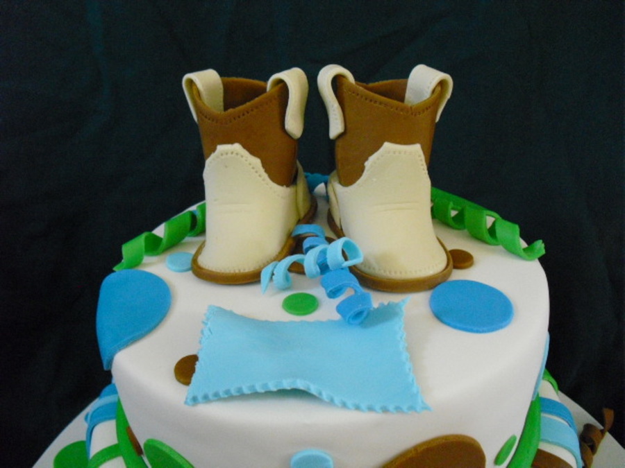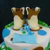 Baby shower cake, put feet on board- styrofoam balls. I hope they hold up! Fondant, rattle styro covered w/fondant. Inspired by CCer's. thanks so much!! Mother 2 be, a rodeo gal, asked for monkeys, but the boots are a surprise.