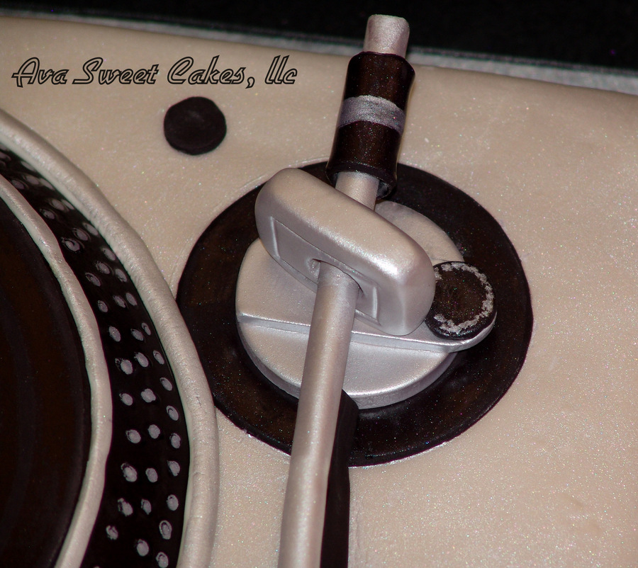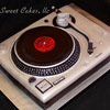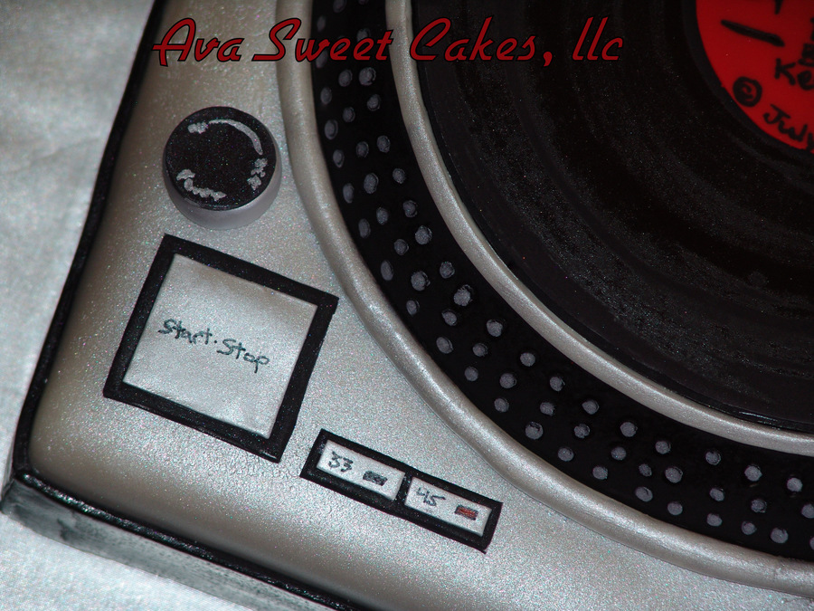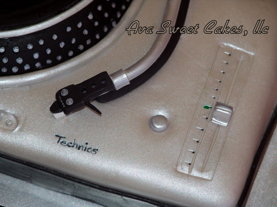 This is a Technics turntable. Everything is edible. The components are made out of gumpaste. The record say the birthday boys name as the Album name, "Happy Birthday" is the sone, "Produced by S&S Bird" his parents, "Remixed by Kari Bird" his wife, and the copyright is his birth date.