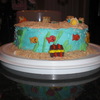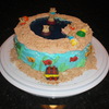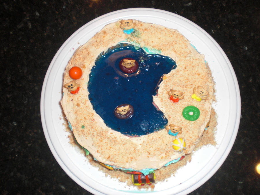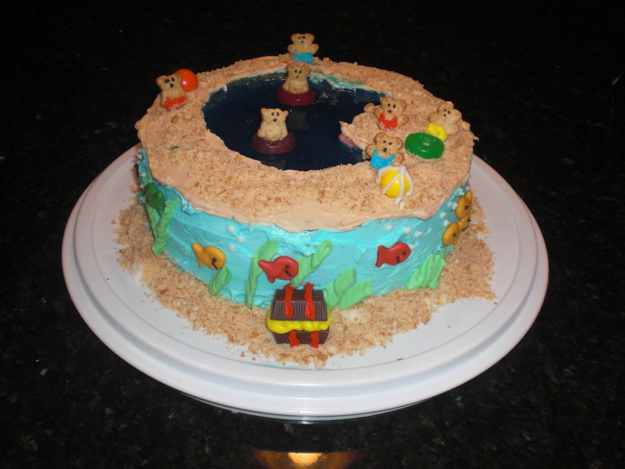 This is my adaptation of the womans day teddy gram pool cake. Cake is a 9 inch with the pool cut out filled with blue jello. Teddy graham decorations, lifesaver innertubes, golfish crackers, jawbreaker beachballs, Hershey chocolate treasure chest, vanilla wafer sand. Was a fun cake to do!