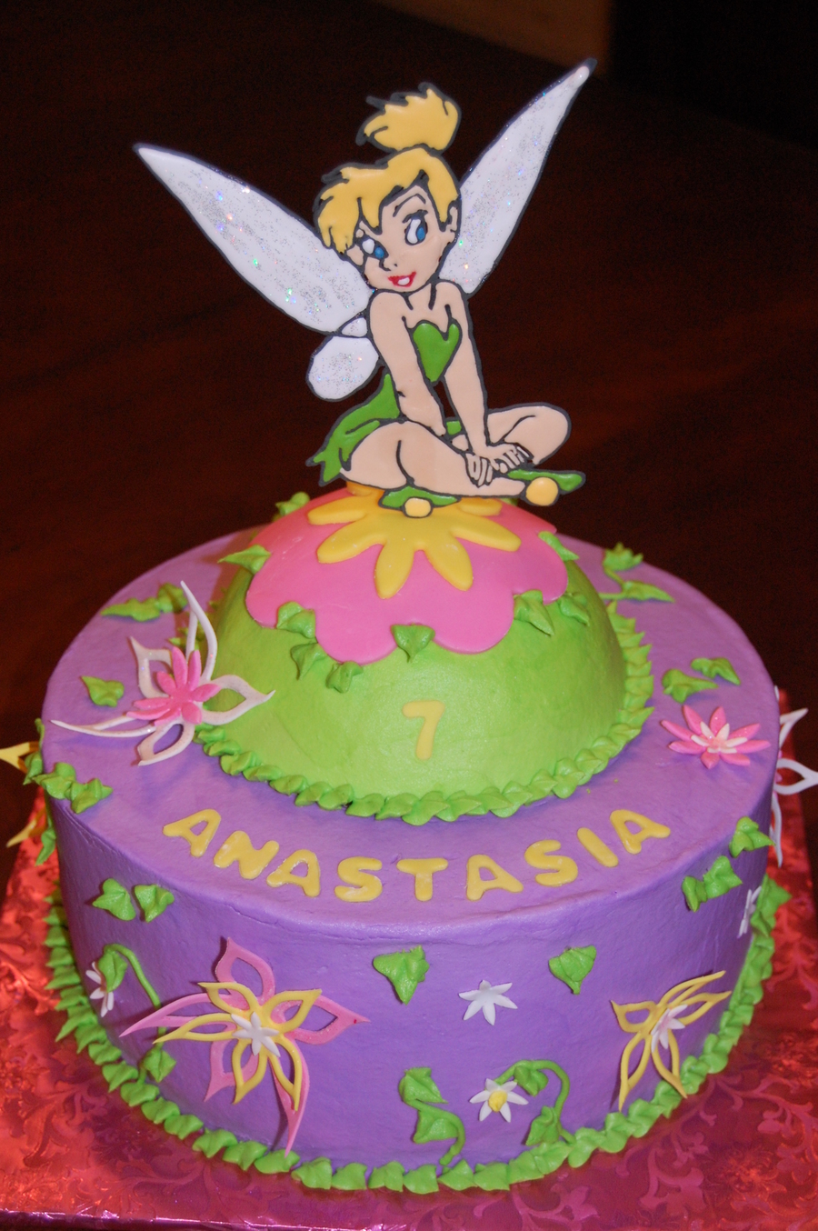 Ten inch strawberry cake with 1/2 ball pan cake on top. All BC with fondant and gumpaste accents. Tinkebell was done with a RI transfer attached with melted white chocolate to a lollipop stick.