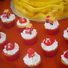 chocolate and guava cake 2 flavors ...chocolate on the top and guava in the 1 tier/ cupcakes are vanilla..candles on the top of the cupcakes