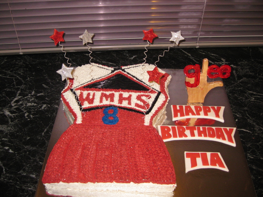 Sponge cake with Butter Cream piping all over. Stars, writing and Glee logo all from Fondant
