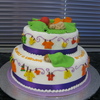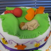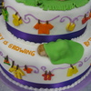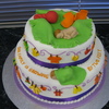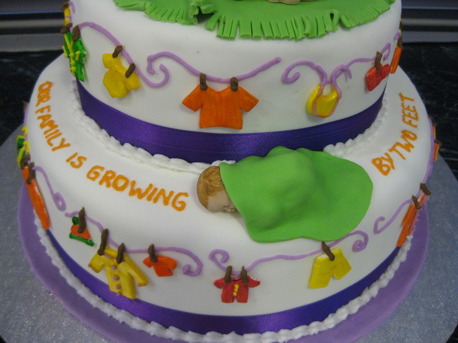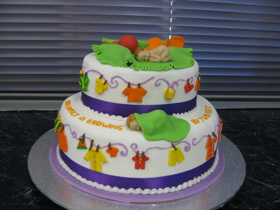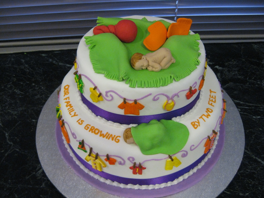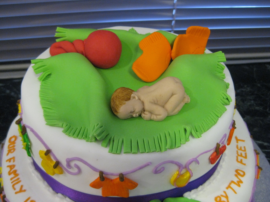 Made Butter Vanilla sponge for bottom layer and chocolate for top layer. Covered with Fondant. All accessories including baby is made from fondant. Border is made from royal icing.