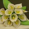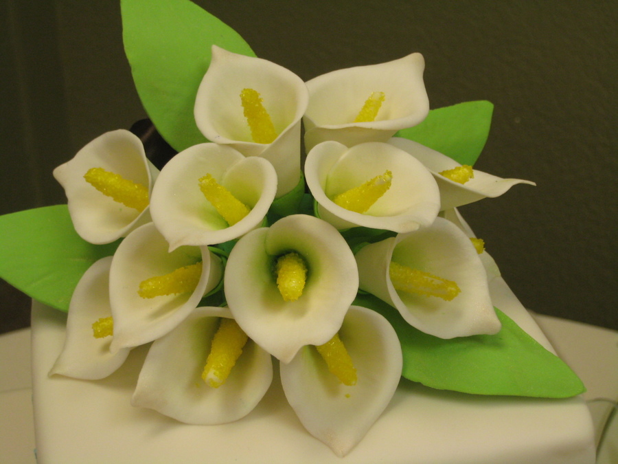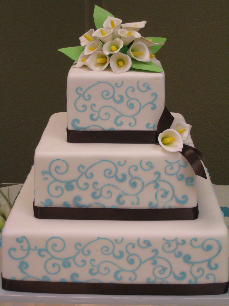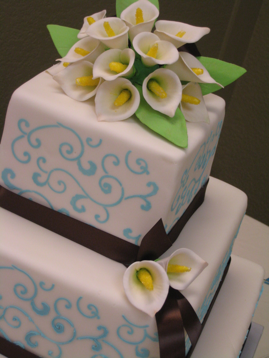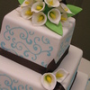 6 x 10 chocolate with choc bavarian cream; 14" vanilla with cheesecake bavarian; royal icing stenciling; gumpaste calla lilies