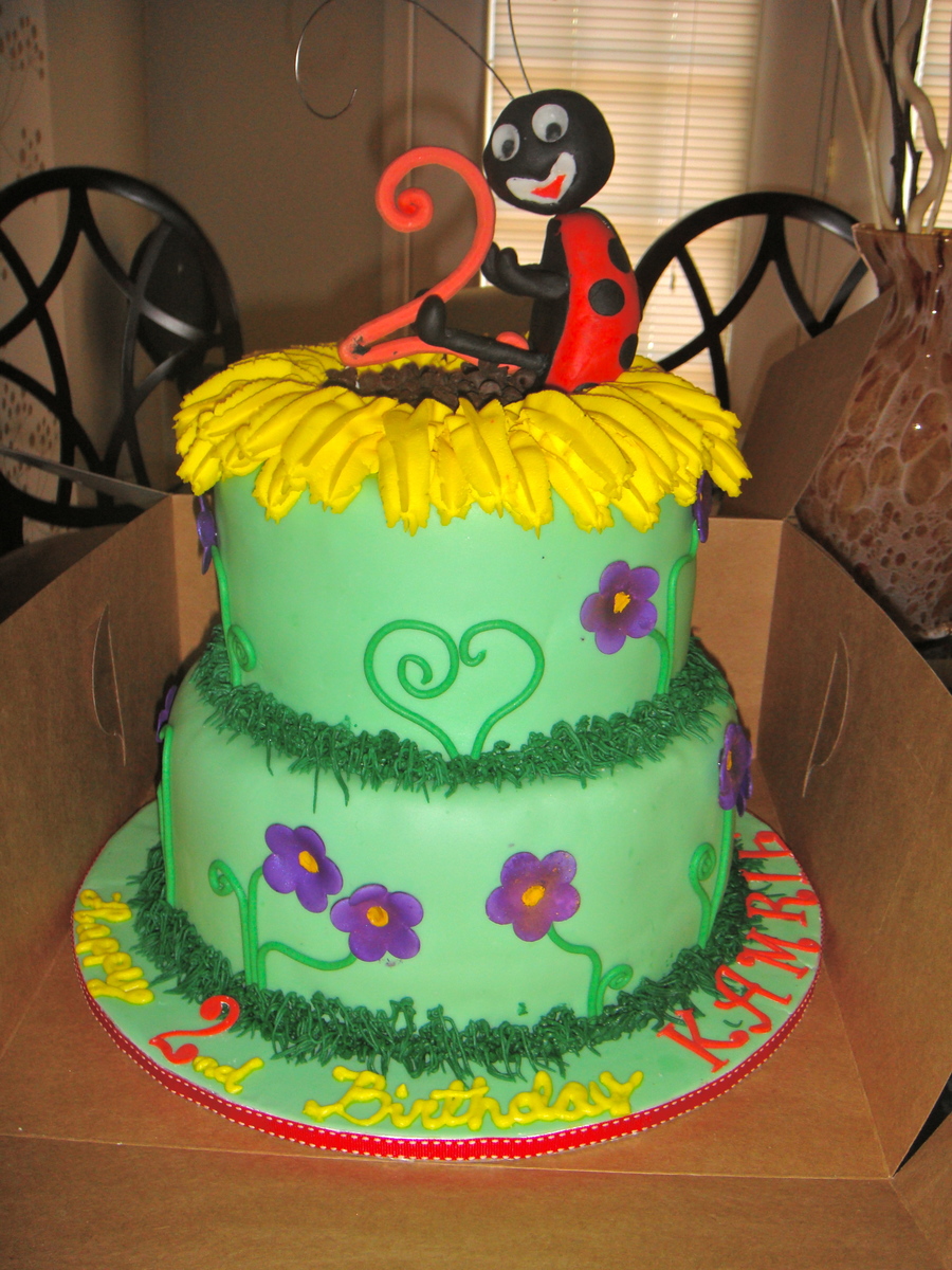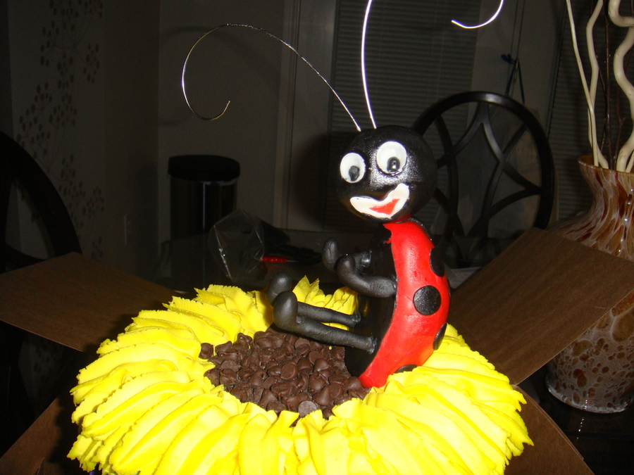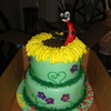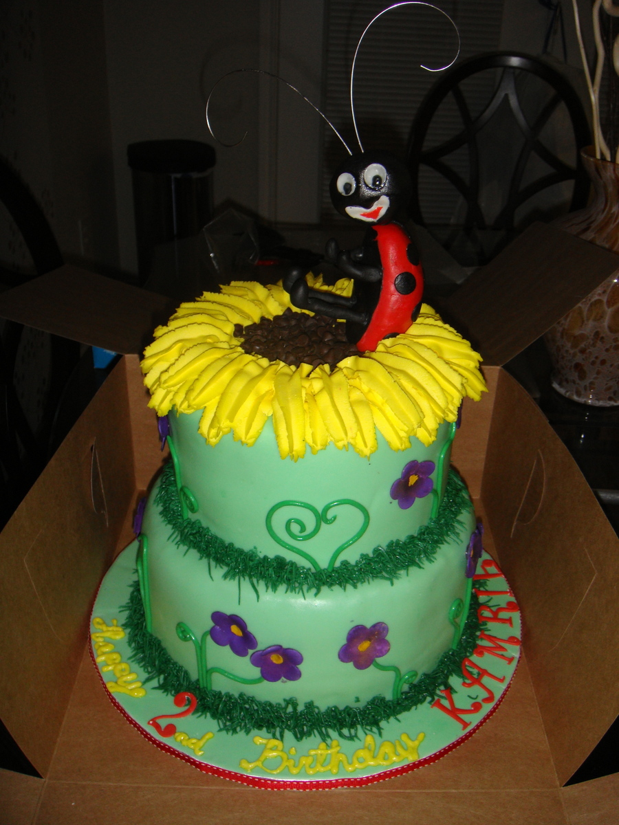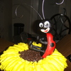 Fondant covered cake w/ gumpaste flowers. Ladybug molded with RC (thanx cherry bomb for sunflower idea)