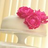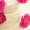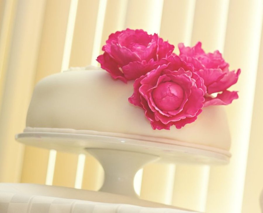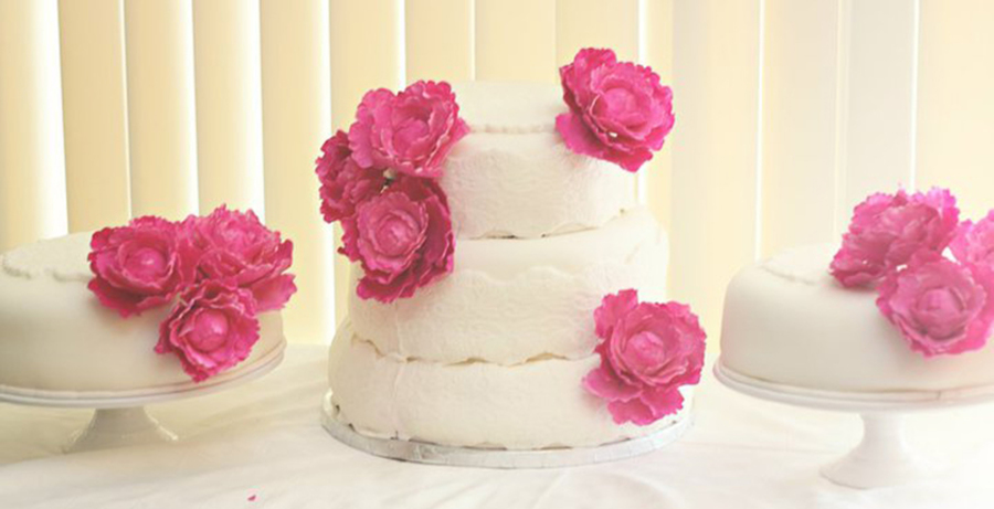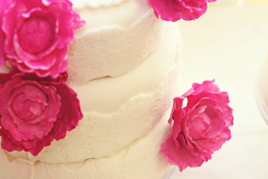 Three tiered vanilla cake with peach and strawberry cream cheese mousse filling. Covered in fonant. Size 8, 10, 12, adn two 12 side ones. Sugar peonie flowers in fuschia. Lace wrap around every tier except the two side ones. Lace medallion on the 8" round and the 2- 12" round side ones.