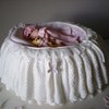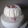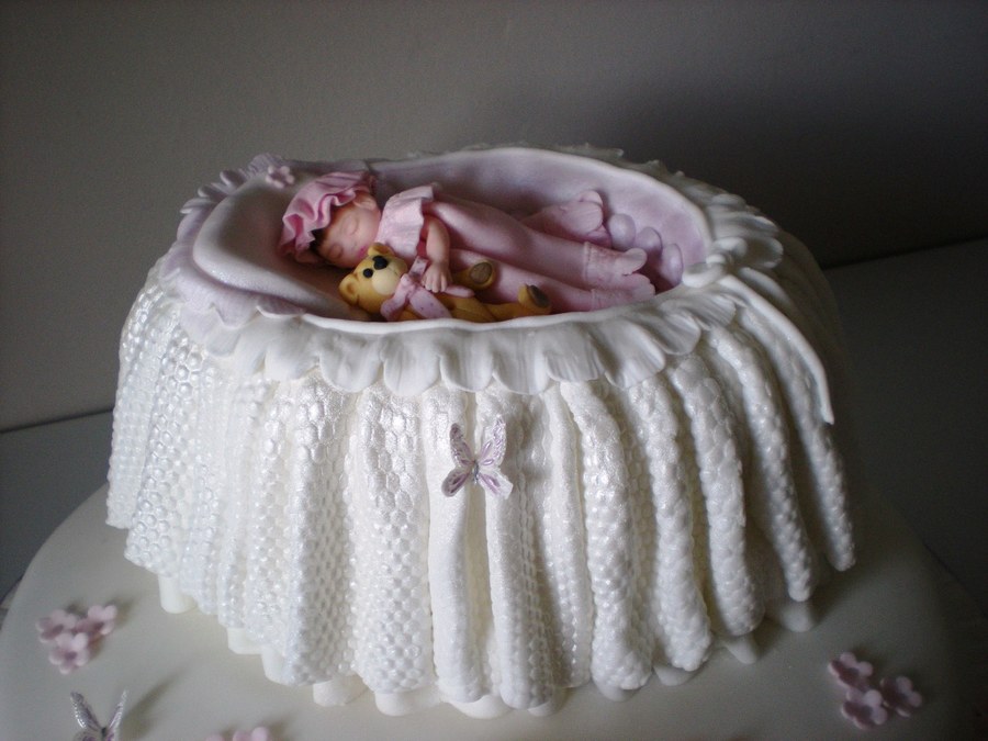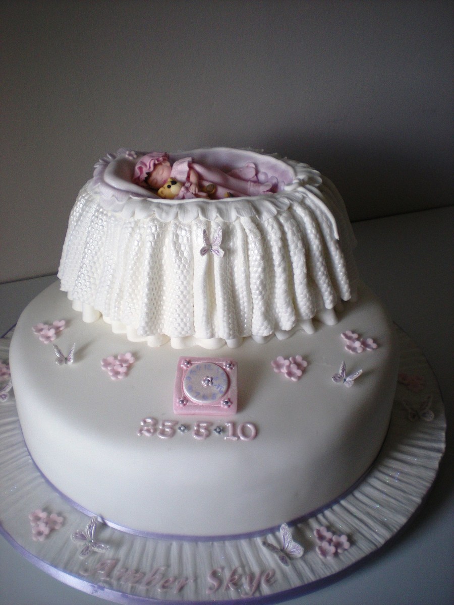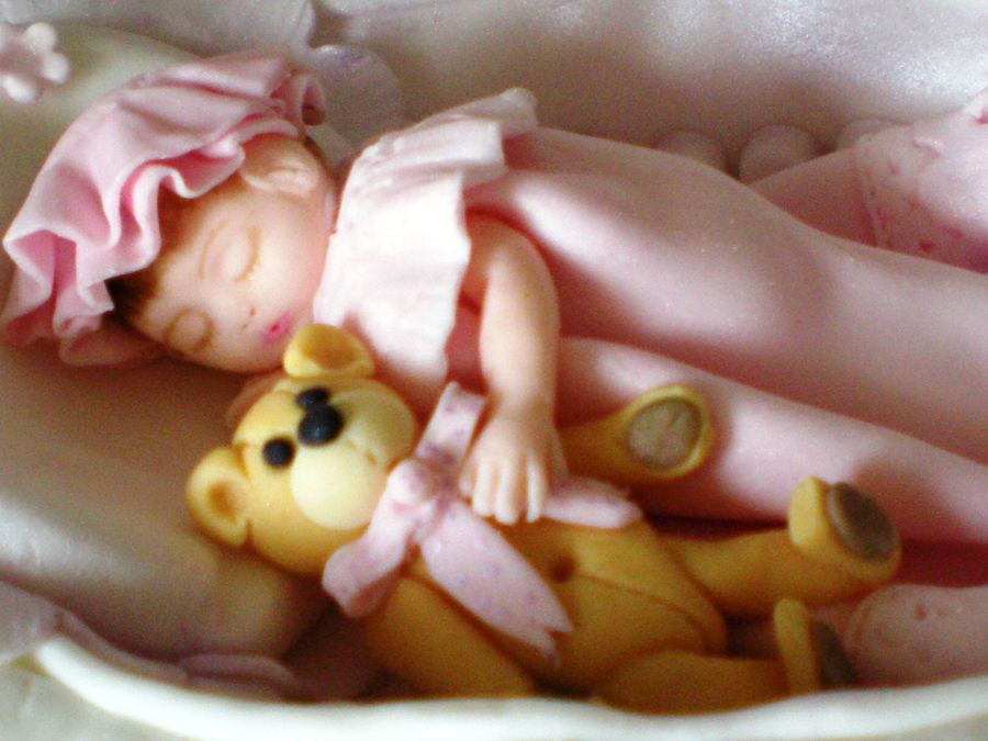 a baby in the cradel with teddy made of sugar paste. this is a design taken and adapted from maisis parrishis book cakes with charecter .the next picture is of the whole cake for a christening of a little girl the time of birth is in the clock. the next pic ic the cradle made of madera cake and covered in sugarpaste with cmc added for flexibility every thing is edible.x