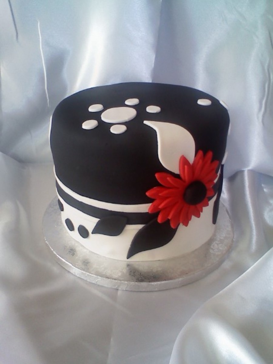 This cake was inspired by the fabulous black & white cake done by Halfbake. This is 2, 2 layer, 8 inch cakes. Top is red velvet with cream cheese buttercream & bottom is lemon with lemon buttercream. Covered entirely in fondant. Thanks Halfbake!