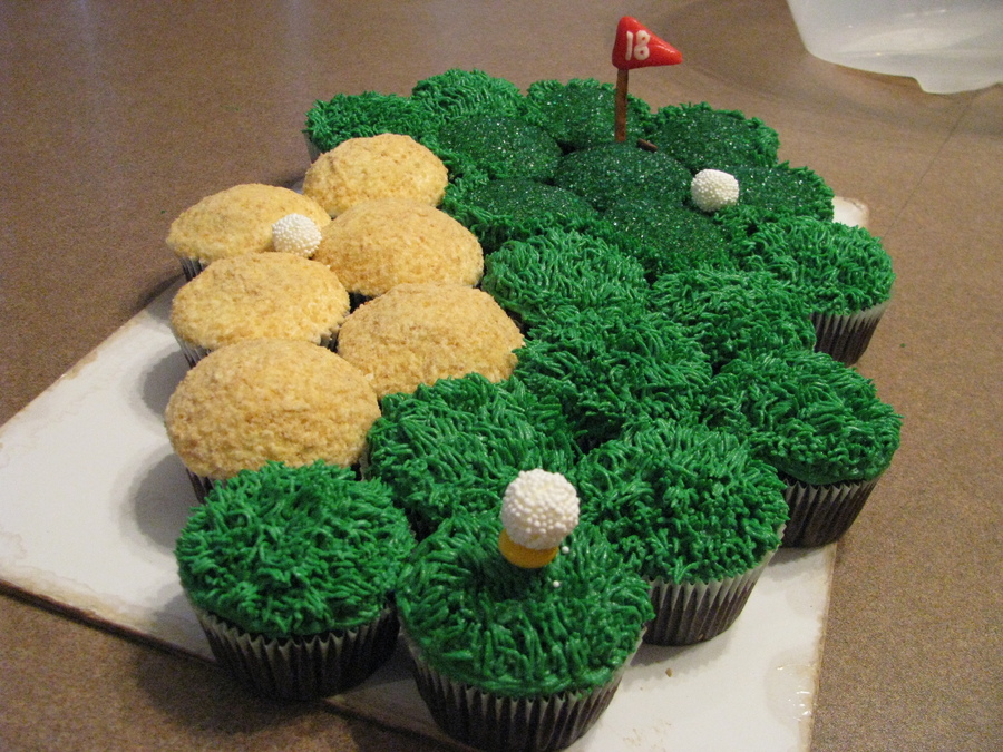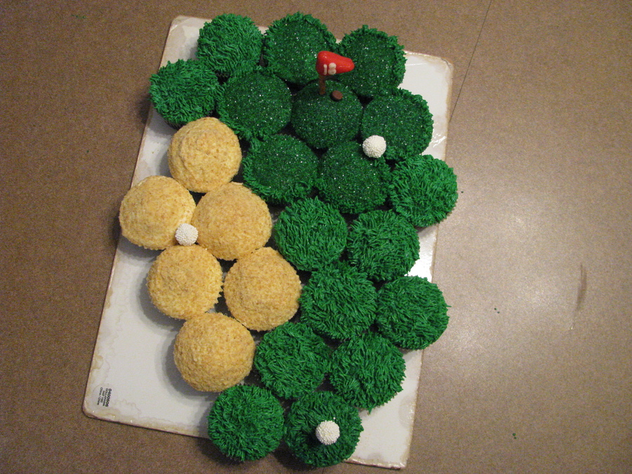 The idea for these cupcakes came from "What's New, Cupcake?" by Karen Tack and Alan Richardson. The sand trap is vanilla wafer crumbs. The golf balls are frozen buttercream icing with white nonpareils on them (I couldn't get them to stick to the gumballs, as the book suggested!) The flag is a pretzel stick with an Air Head candy molded around the top, and the hole is a chocolate chip.