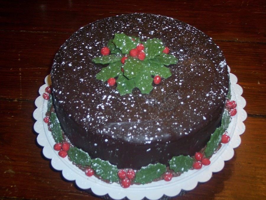 dark chocolate ganache, MMF holly berries & leaves. I decided after taking this picture that I had too much PS 'snow,' so I blew a lot of it off with a cool hair dryer, but it was very well received.