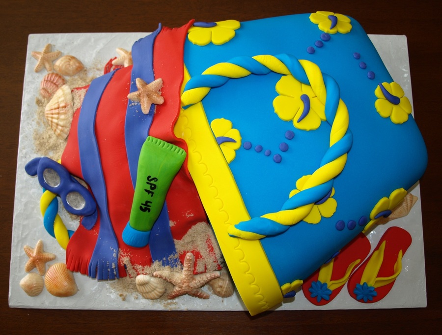 made this 3d beach bag from a 3 layer chocolate cake with one layer of oreo filling and one of chocolate buttercream, white chocolate seashells, fondant sunscreen, beach towel and sunglass painted with silver lusterdust and lemon extract and flip flops.....