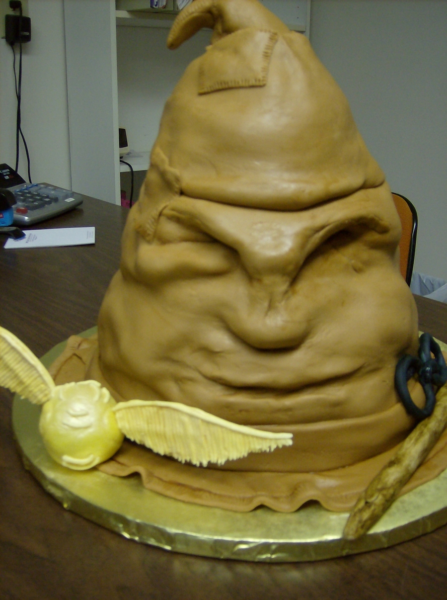 This is a classic example of good fondant gone bad due to humidity and late planning. I did not have enough supplies on hand to make more fondant and had to just make due, at 1 am, with the torn fondant I was working with. The glasses cracked right when I was delivering the cake so I used royal icing to "patch" them, The wand is gumpaste. Snitch is RK covered with fondant with royal icing wings covered with gold powder. I'm so glad small children are "forgiving"!!!