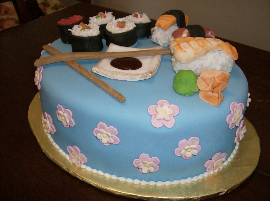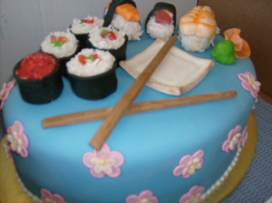 First time I've ever attempted to make sushi and was soooooooo surprised at how easy it was to do.( I love the "real" look anyone can make using fondant and some food color!!) This cake was for a woman so I gave it a more feminine look by adding little cherry blossoms!! The chopsticks are gumpaste. Chocolate syrup sits in the fondant dish. Can't get any easier than lime green fondant for wasabi!!
