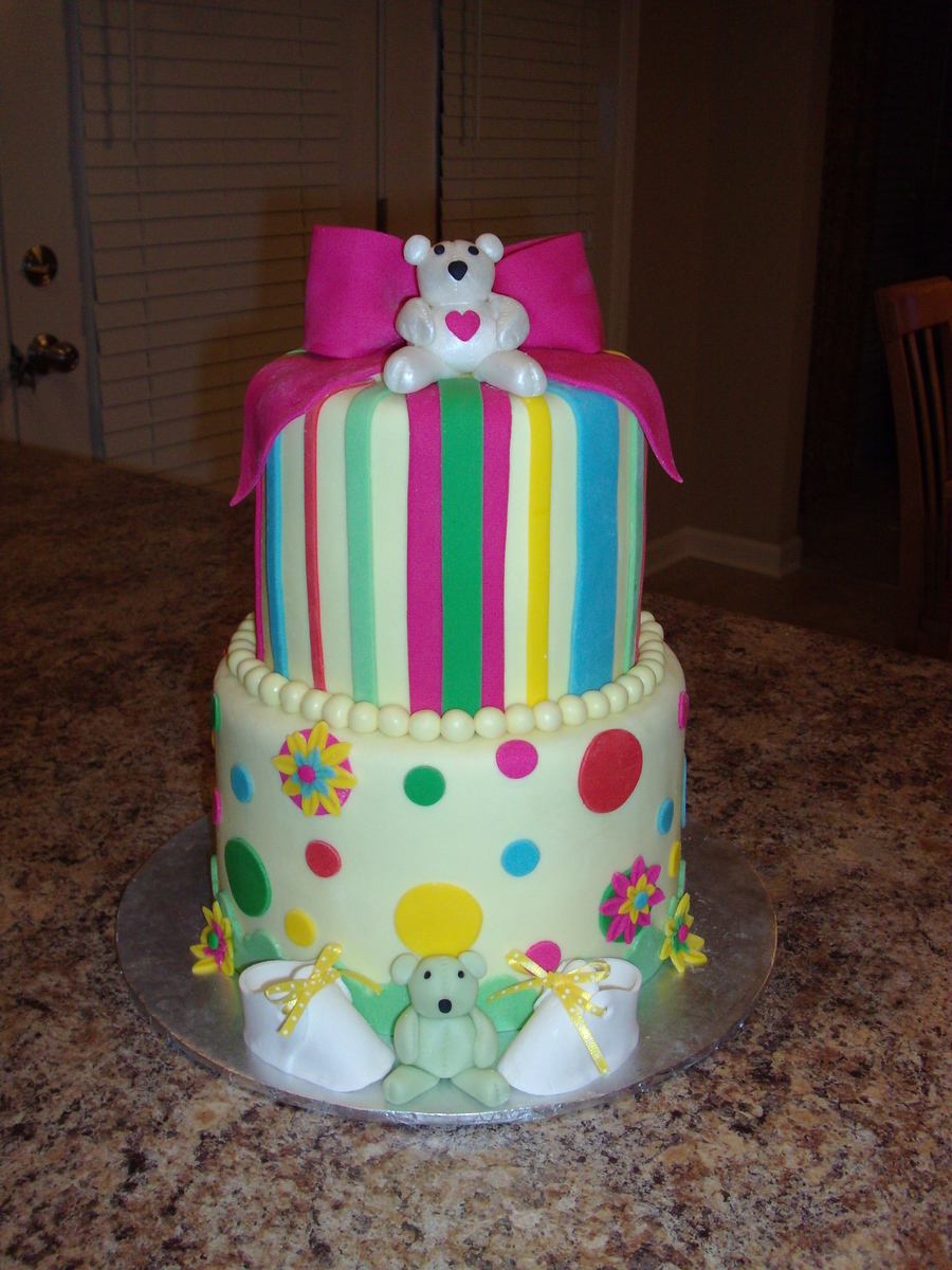 This is a baby shower cake made for a co-worker who wanted bright colors but the invitations were pastel so I used the same colors just a brighter version. Everything is MMF. TFL