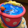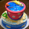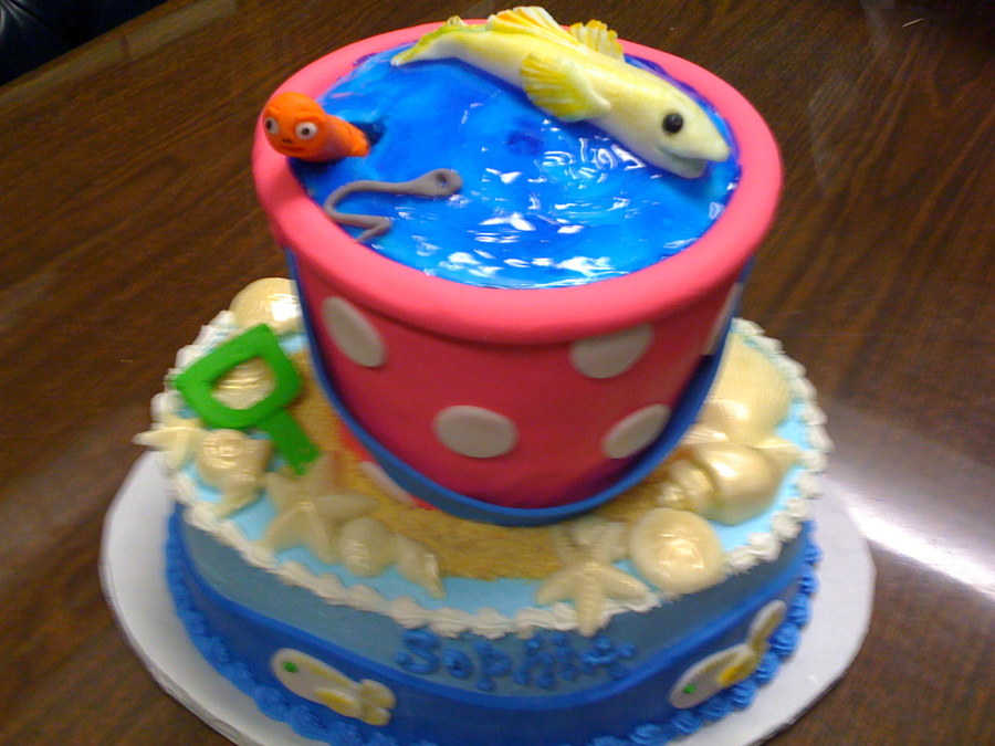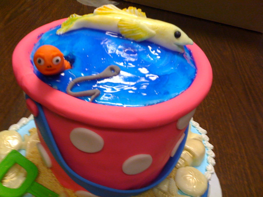 This cake was created for a cute 10 year old girl visiting this coast and wanted to "fish at the beach". Fondant covers the pail and was used for the worm and fish, piping gel water and white chocolate shells were used.
