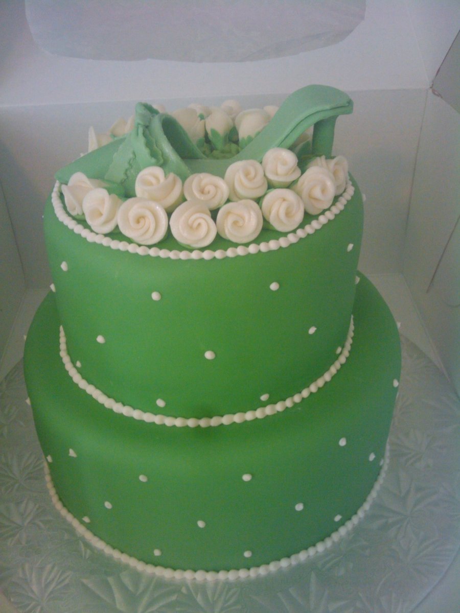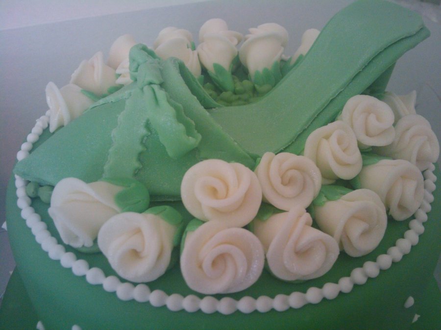 Fondant covered cake, royal icing border and dots, fondant/gumpaste roses and shoe. Thanks for looking! :)