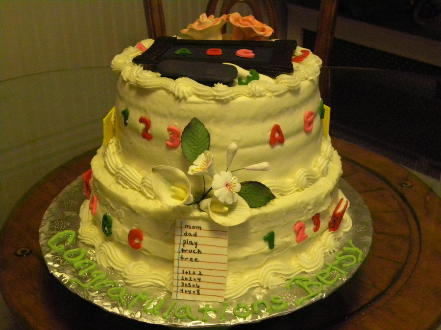 My first tier cake. I wasn't to happy how came out stacked. Made for my sister-in-law retirement. Botton tier is carrot cake with crusting cream cheese frosting, top tier is chocolate cake with white chocolate truffle filling. Gumpaste and fondant decorattions.