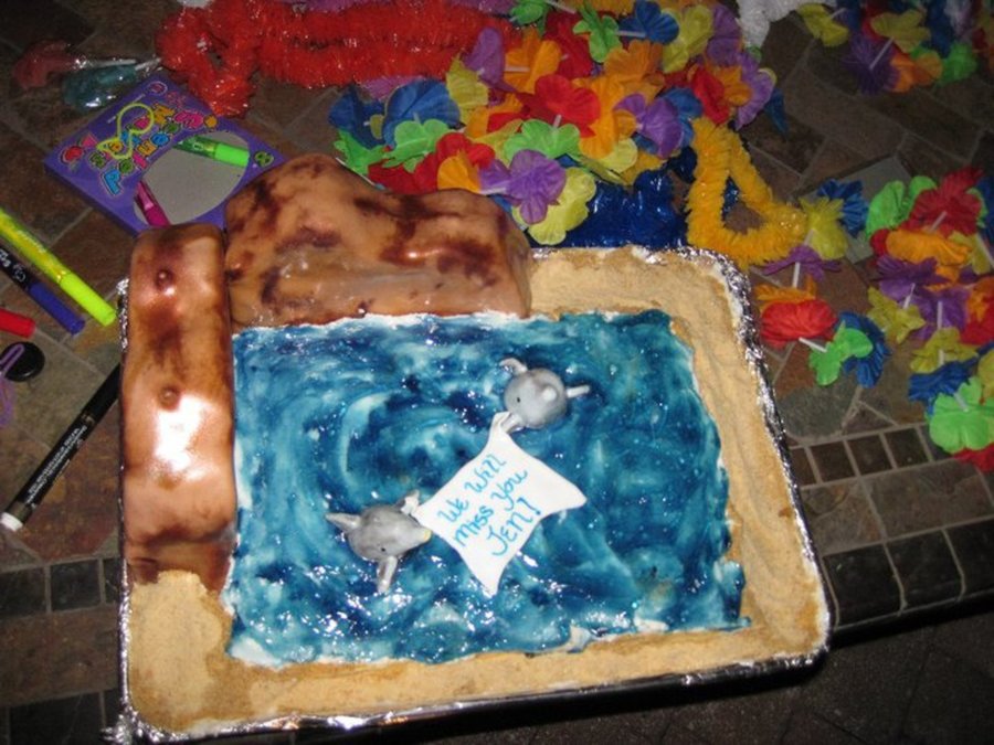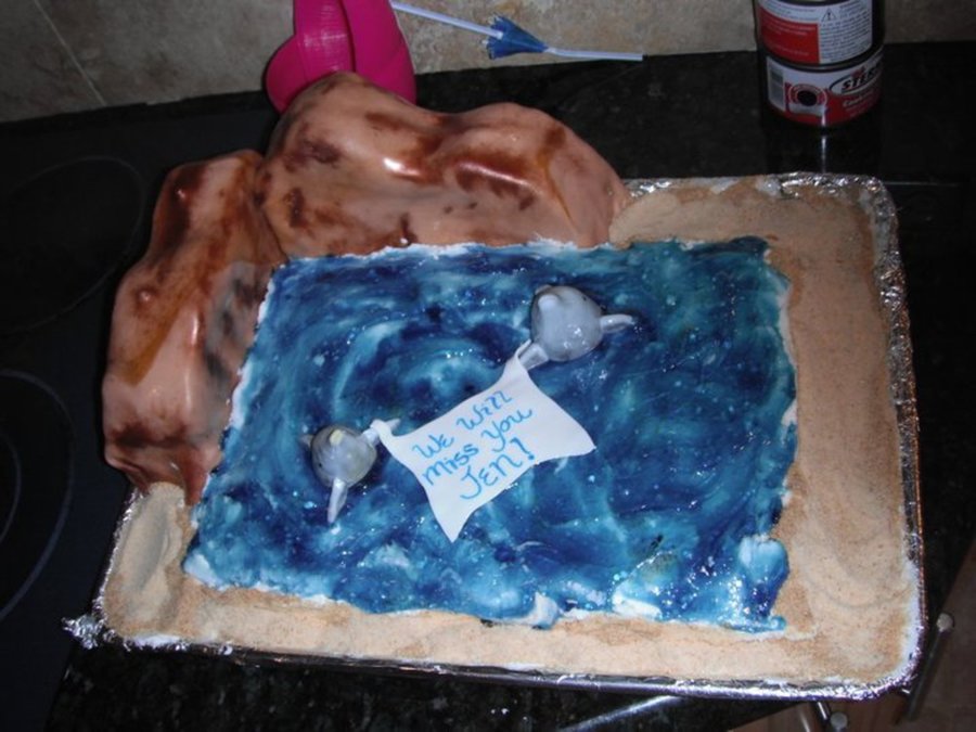 The dolphins are made of gumpaste, the sand is brown sugar and gram crackers, and the rocks are cake covered in fondant. I colored piping gel for the water.