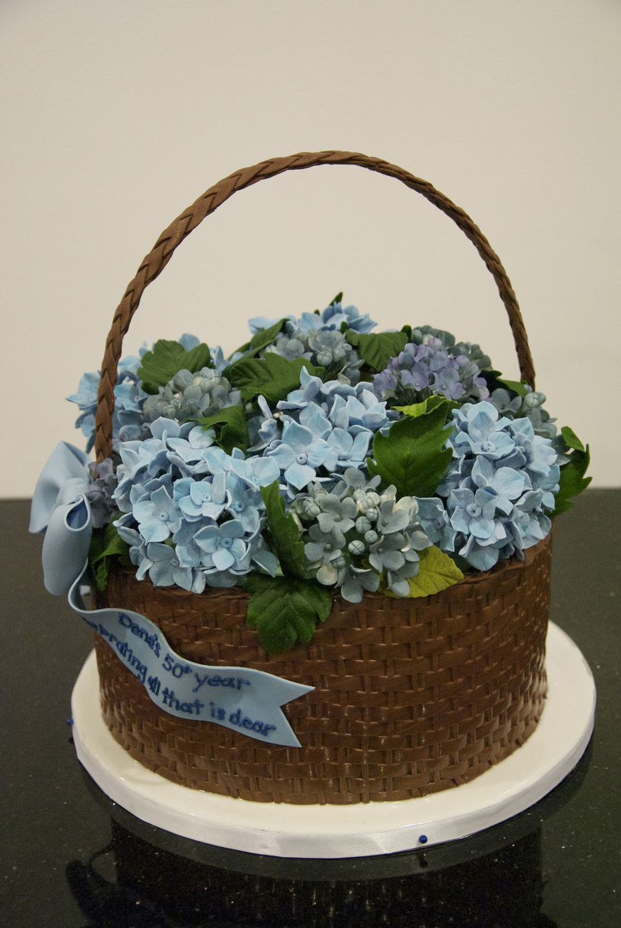 A woven textured basket cake filled with gum paste hydrangea for a 50th birthday.