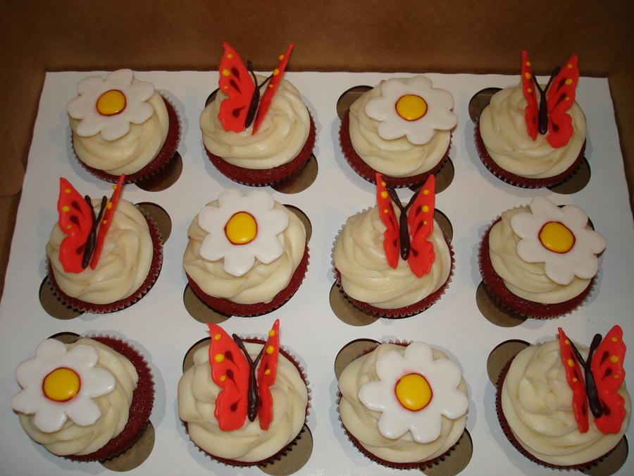 Royal icing butterflies and flowers on red velvet cupcakes. TFL!