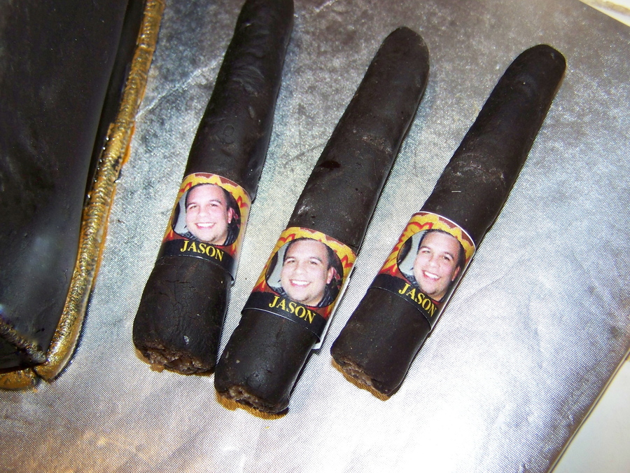 Happy Birthday Jason! This was a pleasure to make for my favorite nephew who is a cigar aficionado. Red velvet (his favorite) cream cheese icing with home-made chocolate fondant. Cigars were made with rice crispies treat and chocolate fondant. Even the cigar cutter was made with sugar paste and food coloring. Everything is edible except the cigar bands which I made with his face on them. It was a huge success!