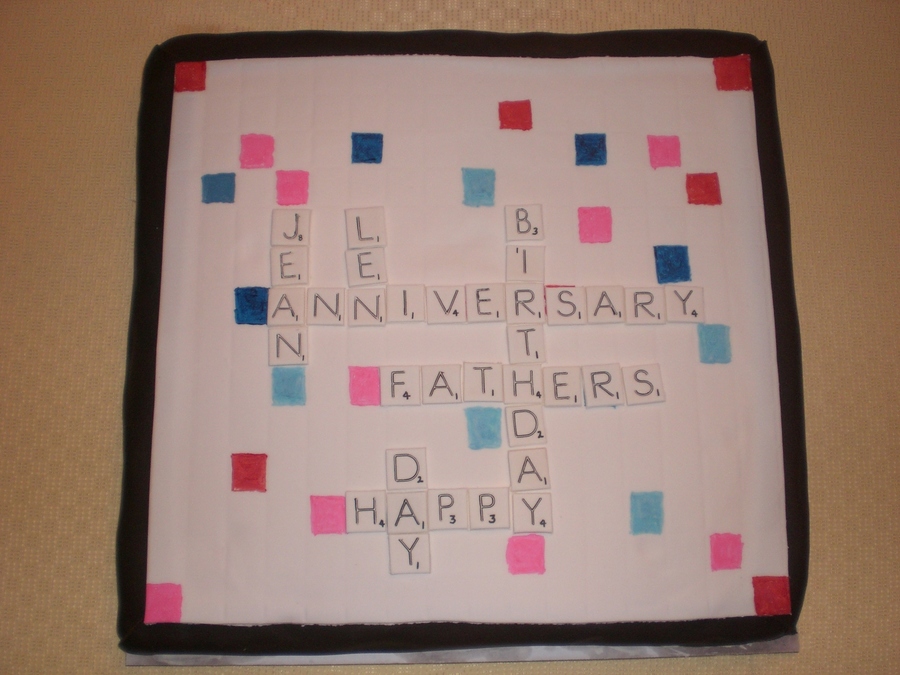 Joint birthday, anniversary and Father's day Scrabble board cake. Fondant covered pound cake with letter pieces made out of gumpaste. Grid pattern an imprint of an overhead flourescent lighting fixture plastic cover (comes in sheets at hardware store).