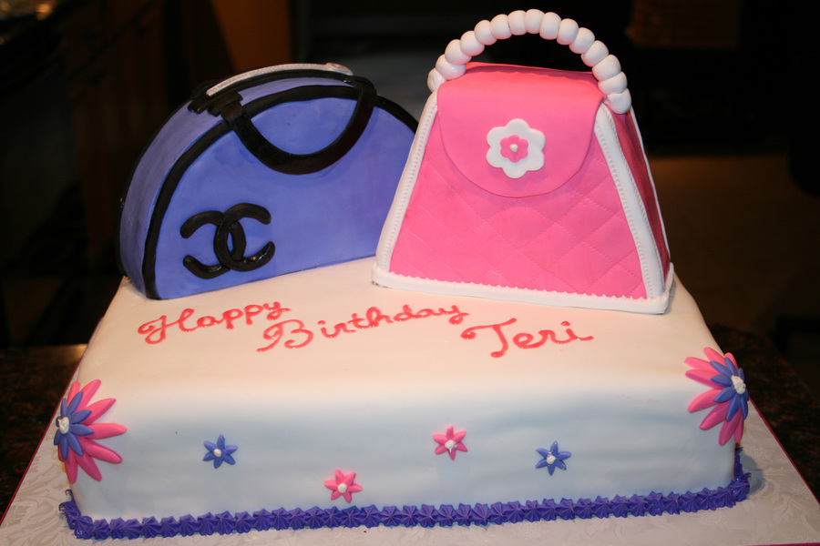 The two purses were made out of 2-9"round cakes. The pink beaded handle was made from fondant rolled into balls and threaded onto a piece of wire. The bottom cake was 11X15 and was 3 layers. All red velvet and buttercream.