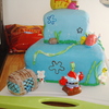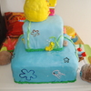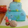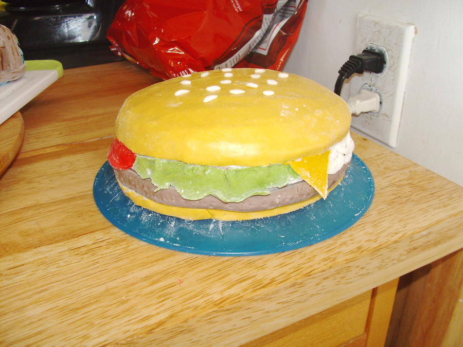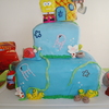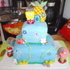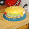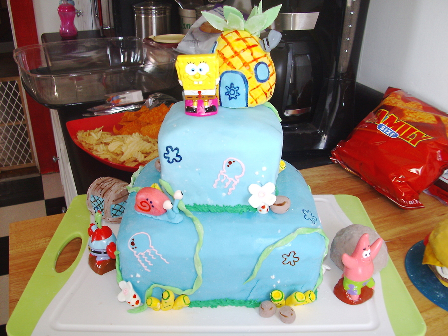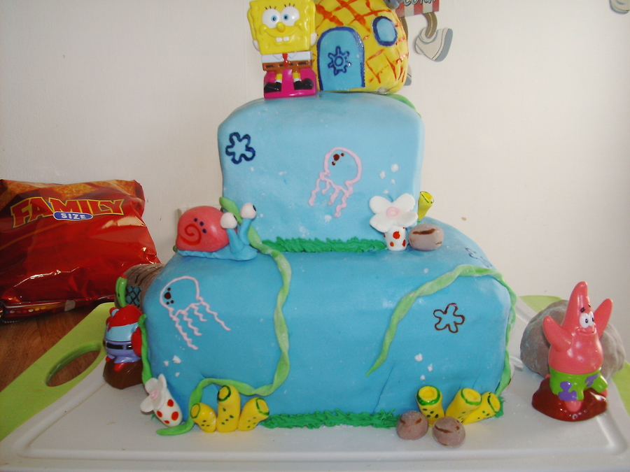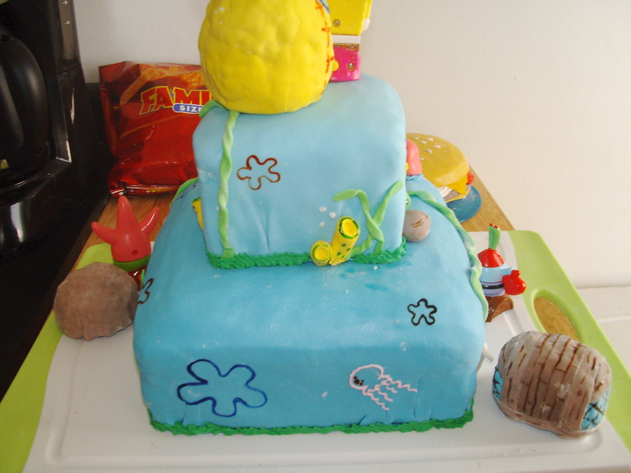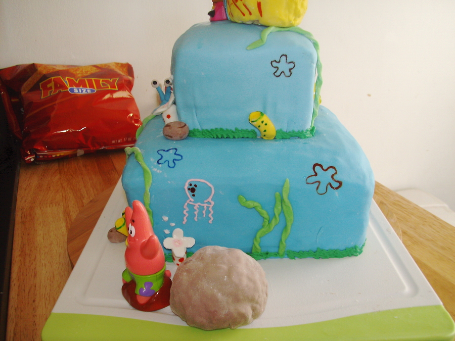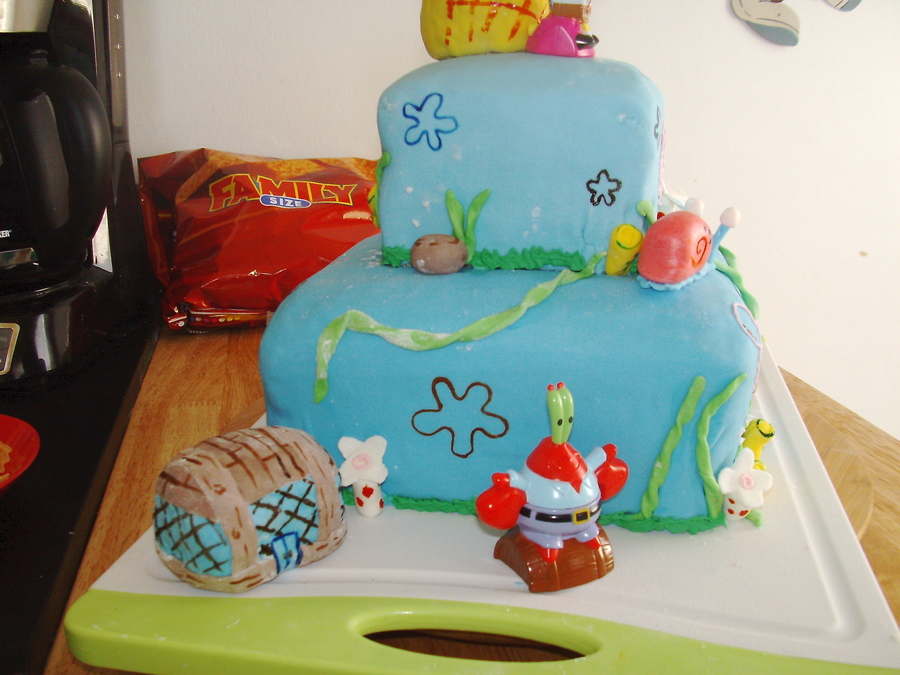 This one is my second cake ever a few months ago and was for my son's 1st birthday. 2 tier marshmallow fondant covered cake with buttercream icing jellyfish, and fondant rocks, seaweed, coral and a solid fondant gary. The Krusty Krab, Patrick's rock, and the pinapple are rice krispie treates coverd with mm fondant and hand painted flowers in the 'sky' and details on objects.For his 1st birthday personal cake, I made a Krabby Patty with a small cake, covered it in mm fondant and added the toppings also made out of mm fondant.