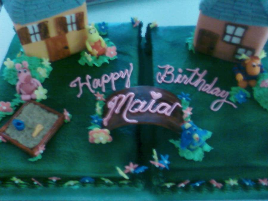 This is the first cake I made for Cakes for Kids Las Vegas. It is a vanilla cake covered in buttercream icing (Tonedna's recipe). The characters are hand made from fondant. The houses are fondant covered rkt.